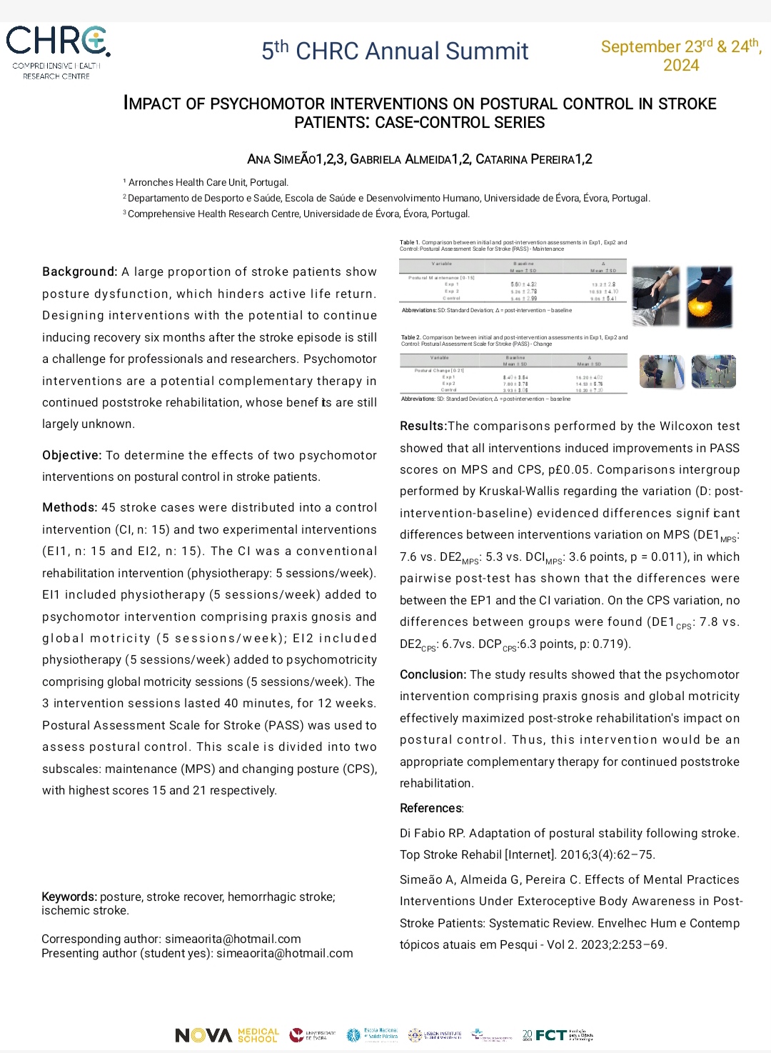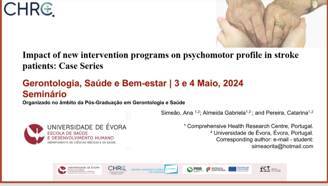 Simeão, Ana; Almeida, Gabriela; Pereira, Catarina Lino Neto. "Impact of psychomotor therapy on psychomotor profile and interoceptivebody awareness in stroke patients: Case Series". 4th Comprehensive Health Research Centre Annual Summit, Évora (2023)